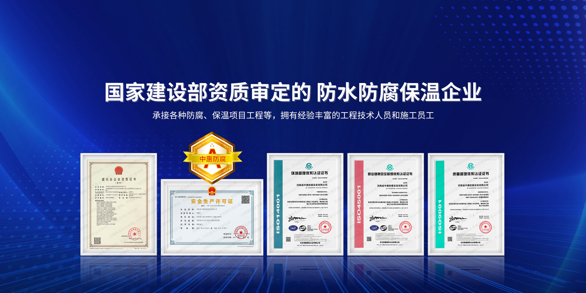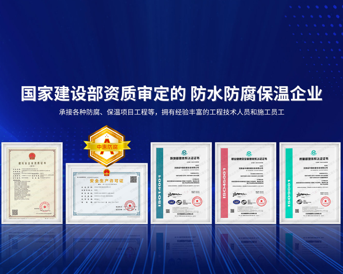 公司經營范圍:防水防腐保溫工程;消防設施工程;建筑裝修裝飾工程;建筑機電安裝工程;電力工程;建筑工程;石油化工工程;工業清洗工程;油罐清洗工程;鋼結構工程;環保工程;模板腳手架工程;電纜防火封堵、防污閃噴涂、外墻外保溫工程;各類施工勞務作業;設備維修、船舶鉚焊、涂裝;電力工程材料、建材、防水材料、防火材料、防腐保溫材料銷售,并相繼通過了GB/T19001-2008idtISO9001:2008GB/T50430-2007質量管理體系認證證書。GB/T24001-2004idtISO14001:2004環境管理體系認證證書。GB/T28001-2011idtOHSAS18001:2007職業健康安全管理體系認證證書。公司是中國防腐蝕于防護協會、中國施工企業管理協會、電力協會和中國鋼結構防水協會會員單位。 公司的經營業務涵蓋了石油、化工、電力、冶金、煤炭、船舶、國防、燃氣、水利、環保、交通運輸、航空及國防軍工和輕紡市政等行業的防腐保溫絕熱設備。鋼結構安裝、防火、防水、金屬噴鍍、聚脲噴繪、陰極保護、防滲透堵漏、玻璃鋼及各種磚版材料襯里、橡膠襯里、煙氣硫和耐酸溶劑腐蝕等工程施工。公司連續十年榮獲“省市先進施工企業”“安全生產先進單位”“重合同,守信用企業”和“AA***資質企業”的稱號。2000年被命名為市級文明單位,2002年被國家工商行政管理局命名為“重合同,守信用的企業”、被中國工業防腐蝕技術協會命名為“防腐蝕企業,能源節約及環境保護領域有豐富的經驗和***的業績。工程一次交驗合格率100%。其中攀枝花鋼鐵公司煉鐵廠四號高爐及熱風爐防腐工程、上海寶鋼公司煤氣柜防腐工程、撫順石油一廠裝置防腐項目、齊魯石化公司稀烴廠高塔防腐工程、吉林化學工業公司煉油廠油罐防腐工程、天津石化熱電廠六號爐頂棚聯絡管保溫工程、大慶油田(太倉)力神泵業工程、中國化學工程第十一建設工程、中原油田勘探局工程、中國石化銷售有限公司華北分部、魯皖輸油管道工程、貴州開磷息烽合成氨工程、陜西黃陵煤化工程、中國石油天然氣西部管道塔里木輸油工程、邯鋼集團邯寶鋼鐵公司煉鐵工程、德州供電工程、吉寶(南通)船廠工程,偃師華潤熱力工程、鄭州熱力總公司。 河南省中惠防腐安裝有限公司愿以豐富的施工經驗,***的技術,***的設備,***的管理,***的服務,竭誠為國內外廣大的用戶提供***滿意、******的工程作品。 我公司愿與國內外同仁一道,團結協作,共同推進防腐蝕行業發展! 公司地址:河南省長垣縣建設路北段360號 固定電話:0373-8866488 郵編:453400 網址:http://www_zhff_com_cn.ahxunhe.com